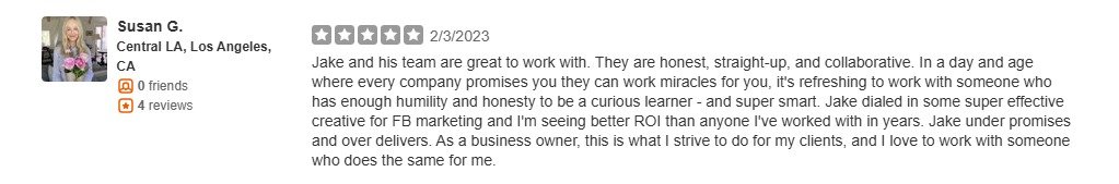 Jake and his team are great to work with. They are honest, straight-up, and collaborative. In a day and age where every company promises you they can work miracles for you, it's refreshing to work with someone who has enough humility and honesty to be a curious learner - and super smart. Jake dialed in some super effective creative for FB marketing and I'm seeing better ROI than anyone I've worked with in years. Jake under promises and over delivers. As a business owner, this is what I strive to do for my clients, and I love to work with someone who does the same for me.