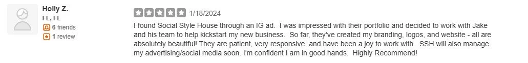 I found Social Style House through an IG ad. I was impressed with their portfolio and decided to work with Jake and his team to help kickstart my new business. So far, they've created my branding, logos, and website - all are absolutely beautiful! They are patient, very responsive, and have been a joy to work with. SSH will also manage my advertising/social media soon. I'm confident I am in good hands. Highly Recommend!