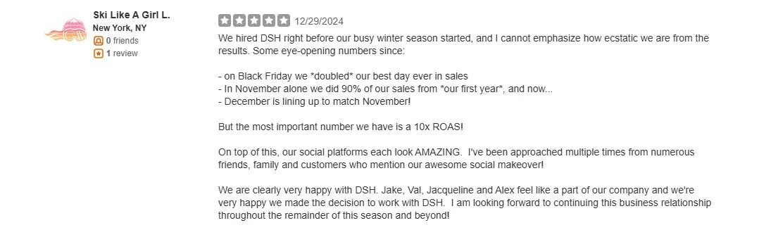 "We hired DSH right before our busy winter season started, and I cannot emphasize how ecstatic we are from the results. Some eye-opening numbers since: