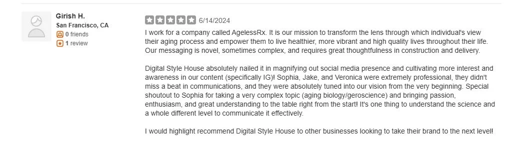Digital Style House absolutely nailed it in magnifying out social media presence and cultivating more interest and awareness in our content (specifically IG)! Sophia, Jake, and Veronica were extremely professional, they didn't miss a beat in communications, and they were absolutely tuned into our vision from the very beginning. Special shoutout to Sophia for taking a very complex topic (aging biology/geroscience) and bringing passion, enthusiasm, and great understanding to the table right from the start! It's one thing to understand the science and a whole different level to communicate it effectively.