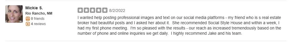 "I wanted help posting professional images and text on our social media platforms—my friend, who is a real estate broker, had beautiful posts and I asked her about it. She recommended Social Style House, and within a week, I had my first phone meeting. I'm so pleased with the results—our reach has increased tremendously based on the number of phone and online inquiries we get daily. I highly recommend Jake and his team."