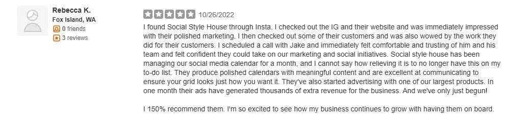 "I found Social Style House through Insta. I checked out the IG and their website and was immediately impressed with their polished marketing. I then checked out some of their customers and was also wowed by the work they did for their customers. I scheduled a call with Jake and immediately felt comfortable and trusting of him and his team and felt confident they could take on our marketing and social initiatives. Social Style House has been managing our social media calendar for a month, and I cannot say how relieving it is to no longer have this on my to-do list. They produce polished calendars with meaningful content and are excellent at communicating to ensure your grid looks just how you want it. They've also started advertising with one of our largest products. In one month their ads have generated thousands of extra revenue for the business. And we've only just begun! I 150% recommend them. I'm so excited to see how my business continues to grow with having them on board."