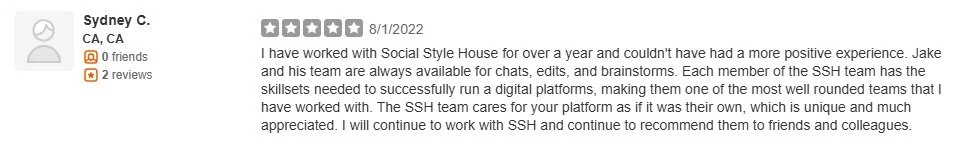 “I have worked with Social Style House for over a year and couldn't have had a more positive experience. Jake and his team are always available for chats, edits, and brainstorms. Each member of the SSH team has the skillsets needed to successfully run a digital platforms, making them one of the most well rounded teams that I have worked with. The SSH team cares for your platform as if it was their own, which is unique and much appreciated. I will continue to work with SSH and continue to recommend them to friends and colleagues.”