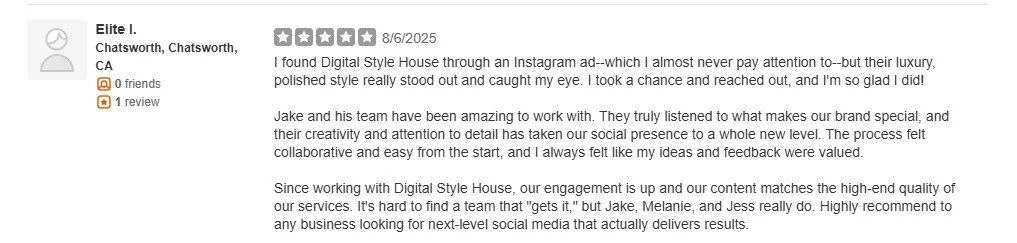 Since working with Digital Style House, our engagement is up and our content matches the high-end quality of our services. It's hard to find a team that 'gets it,' but Jake, Melanie, and Jess really do. Highly recommend to any business looking for next-level social media that actually delivers results."
