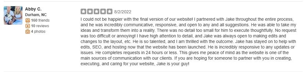 "I could not be happier with the final version of our website! I partnered with Jake throughout the entire process, and he was incredibly communicative, responsive, and open to any and all suggestions. He was able to take my ideas and transform them into a reality. There was no detail too small for him to execute thoughtfully. No request was too difficult or annoying! I have high attention to detail, and Jake was always open to making edits and changes to the layout, etc. He is so talented, and I am thrilled with the outcome. Jake has stayed on to help with edits, SEO, and hosting now that the website has been launched. He is incredibly responsive to any updates or issues. He completes requests in 24 hours or less. This gives me peace of mind as the website is one of the main sources of communication with our clients. If you are hoping for someone to partner with you in creating, executing, and caring for your website, Jake is your guy!"