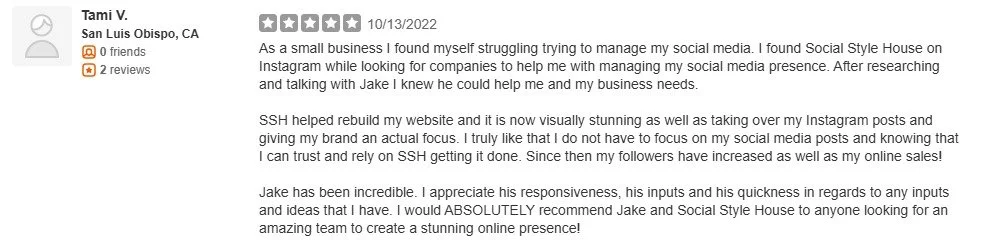 "As a small business I found myself struggling trying to manage my social media. I found Social Style House on Instagram while looking for companies to help me with managing my social media presence. After researching and talking with Jake I knew he could help me and my business needs.